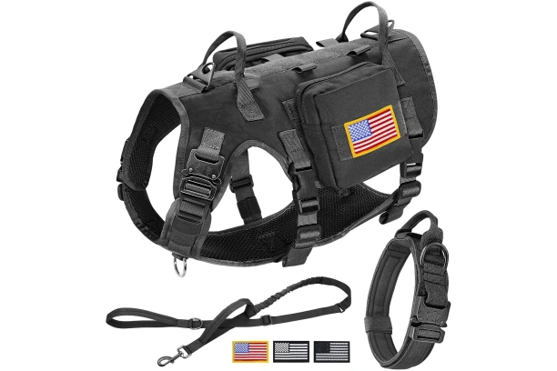 A remarkable value, our full tactical dog harness collar leash set provides everything you need in one comprehensive package. This set includes a military dog harness, two backpack pouches, a tactical dog collar with quick release buckles, a bungee dog leash with two padded handles, and three reflective flag patches. With features designed for superior control during training and walks, such as a padded collar with a foldable handle, a breathable harness with front chest D-ring and two rear handles, and a tactical leash with two handles, this ensemble ensures ease of use and enhanced maneuverability. Built with escape-proof metal buckles, sturdy D-rings, and a molle system for versatile attachments, this set offers durability and adaptability. Designed for heavy-duty use, the tactical dog collar, and adjustable bungee dog leash provide comfort, control, and safety during training and walks, making it an essential companion for your loyal canine.