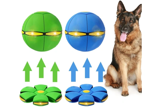 Introducing the versatile dog toy ball that effortlessly transforms into a flying saucer with a simple hand press, reverting to its ball form after a few seconds. This interactive play accessory facilitates engaging interactions with your dog, fostering active play and encouraging exercise. Notably, this toy, embellished with lighting, ensures hours of amusement, even at night, creating a colorful spectacle upon pressing. Crafted from environmentally friendly, high-quality materials, it withstands vigorous play and chewing without posing a risk to your pet's dental health. Perfect for indoor and outdoor settings, this flying saucer ball offers high jumps and diverse play options, effectively promoting both physical activity and mental stimulation for your beloved pet.